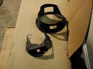 I wanted to utilize the Fiero flipper door, so some modifications were in order. I first thought of extending the metal fuel tube, but upon more detailed investigation I found it to be more work than I was willing to devote to it. The new filler opening doesn't line up with the old filler well enough to simply extend the metal pipe without a tricky curve. but by carefully removing most of the bottom of the fuel filler "cup", ......