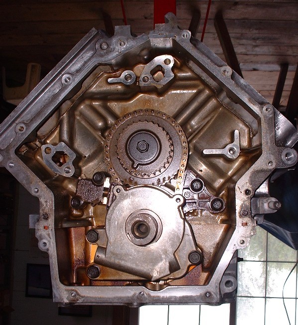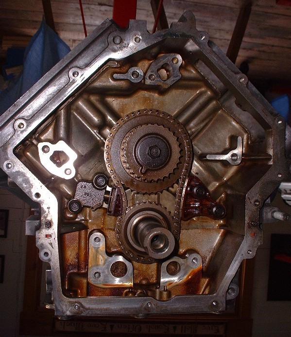 Darkhorizon mentioned it, but I’m sure there are lots of other people who would rather just drop in a used N* and run it until it dies rather than taking it apart. But here’s another reason (and there’s more to come…) why it may not last very long and you’ll find yourself dropping the cradle sooner rather than later. After the oil pump was off, I was able to get to the primary timing chain, crank and secondary sprockets. Have a look at how much the spring loaded chain tensioner on the LH side of the chain is extended.