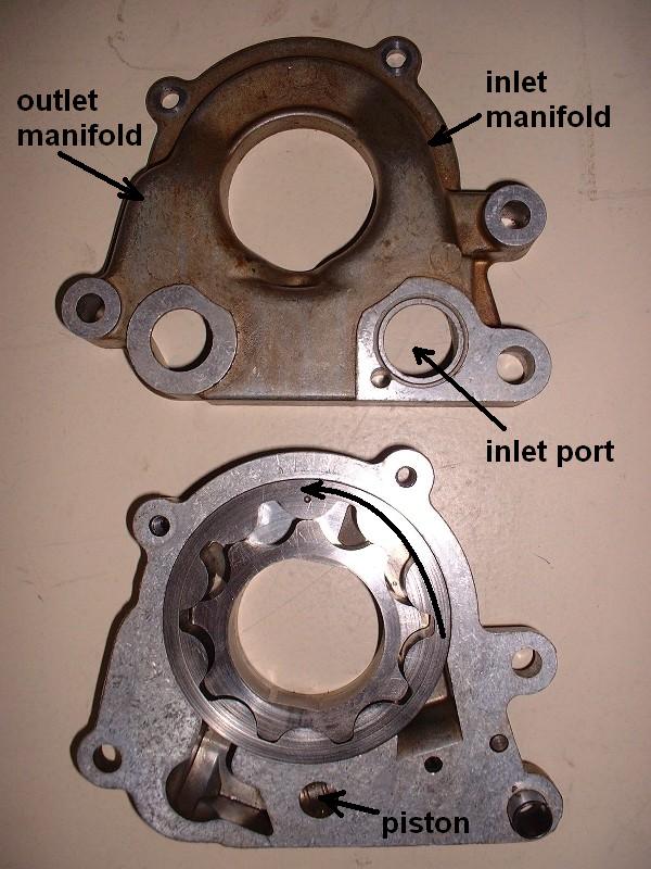 It’s a gerotor-style pump which uses a nine toothed pump gear (or inner rotor) in a ten-toothed gear housing (or outer rotor). As the crank turns counter clockwise in the image below, the inner rotor is keyed to the crank through two flats on the shaft. Since the two rotor's teeth mesh at the bottom, both rotors turn with the crank. As they do so, the space between the teeth of the inner and outer rotor increases towards the top from the 4 o’clock to the 1 o’clock postions, creating a vacuum. The vacuum pulls oil into the pump through the circular port on right hand side of the pump housing. The channel or manifold leading up from the inlet port narrows in diameter as it swirls up to the top of the pump where it meets a dead end and oil is forced between the teeth. The oil is carried around through to the 10 o'clock position where a new manifold opens up. As the rotor continues to turn, the area between the teeth decreases from the 10 o’clock to the 7 o’clock position, pumping the oil into the outlet manifold and through the outlet port.
