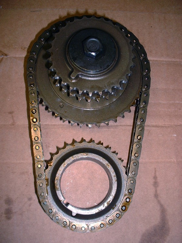 This is what the sprocket assembly looks like when it’s removed from the engine. The upper sprocket bolts onto a bearing assembly situated where the cam would be on an overhead valve (cam-in-block) engine.