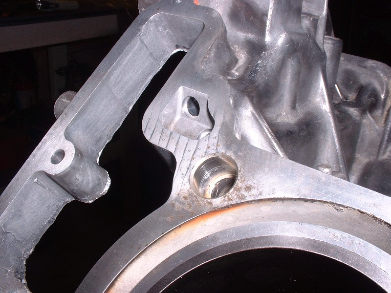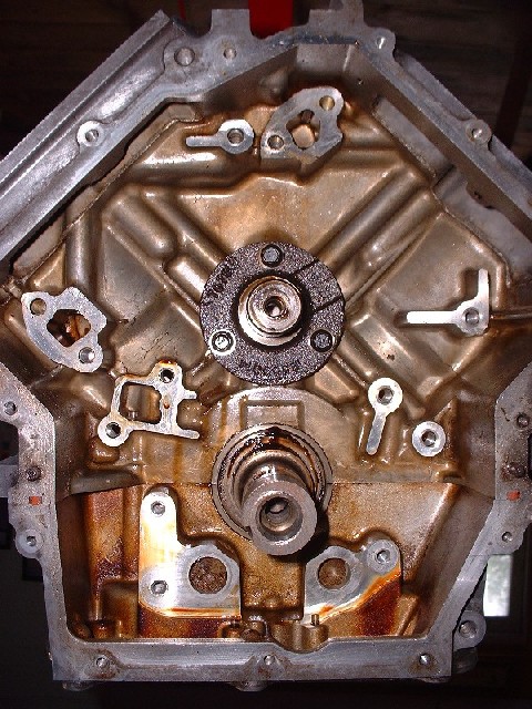 Here’s the bearing assembly the upper sprocket rotates on… note that it gets fed oil from passages cast in the block.