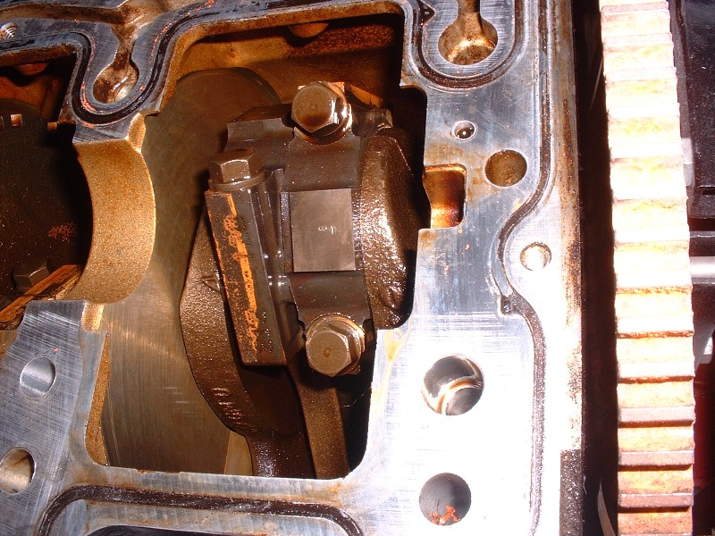 To gain access to the connecting rod cap bolts, you must remove the main bearing cap bolts (all 20 of them) and remove the, pick-up tube...