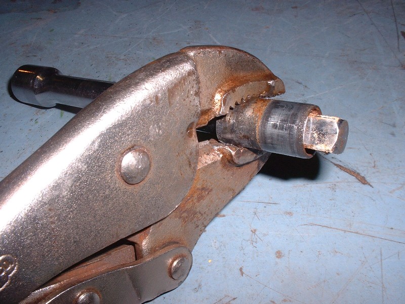 Next up was to remove the four steel head-alignment dowels on the deck surface. They’re swaged in the holes very tightly and are impossible to remove without ruining them. At first I thought they’d come out with a little gentle persuasion, but that gave way to more draconian measures. I’ve seen someone here on PFF remove them by welding a steel rod across the tops and twisting them out that way, but I found an easier method. I used Vise-grips to twist them out but found out that unless you push something into the hollow dowel, the Vise-grips will just deform it and slip rather suddenly. An extension for a 3/8” drive socket wrench fits just right. The extension prevents the dowel from collapsing and from there it was a simple matter of twisting and pulling at the same time. It still took a couple minutes per dowel though.