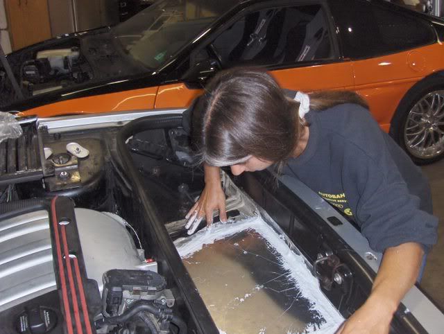 here is a few pics of me putting the sealant on the new trunk floor. Dave welded it in and I applied the water sealer. Joey