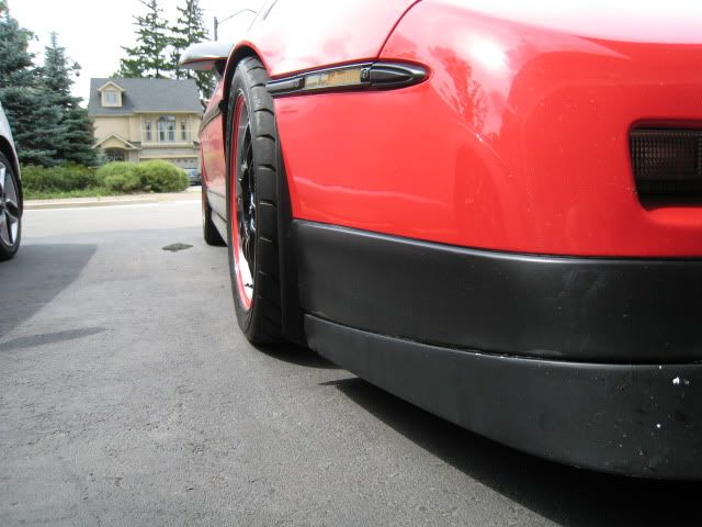 Removed the front "winglets" from the front bumper. They were okay for a while, but I don't like them anymore. Instead, I bought some splash guards and actually placed them in front of the the front wheels. I'm running 225 series tires up front with a 38mm offset rim so they stick out a bit. I've seen these "reverse mudflaps" on some other sports cars. I figured I'd give it a shot, they look pretty good and shield the edge of the tire from air that would create drag on them. Basically they just look cool.
