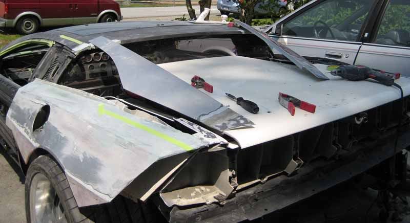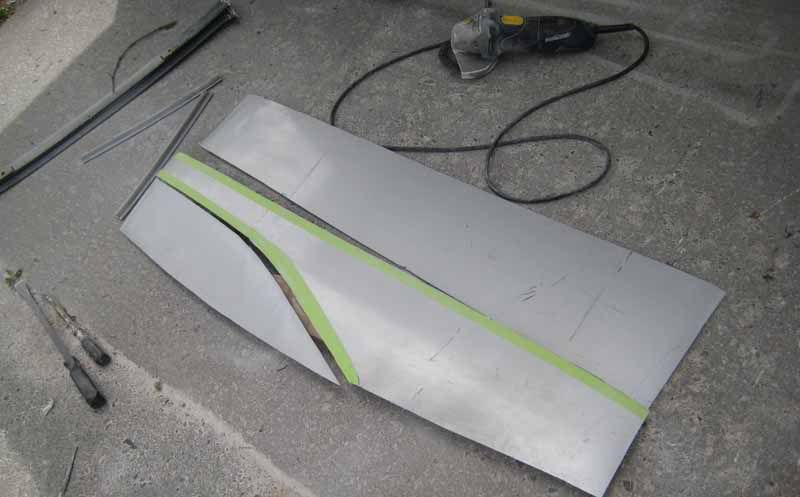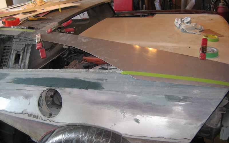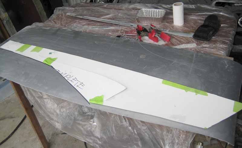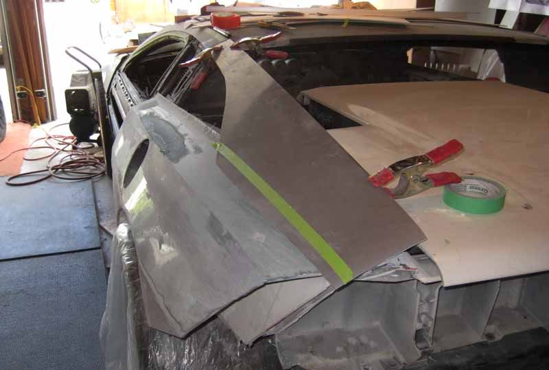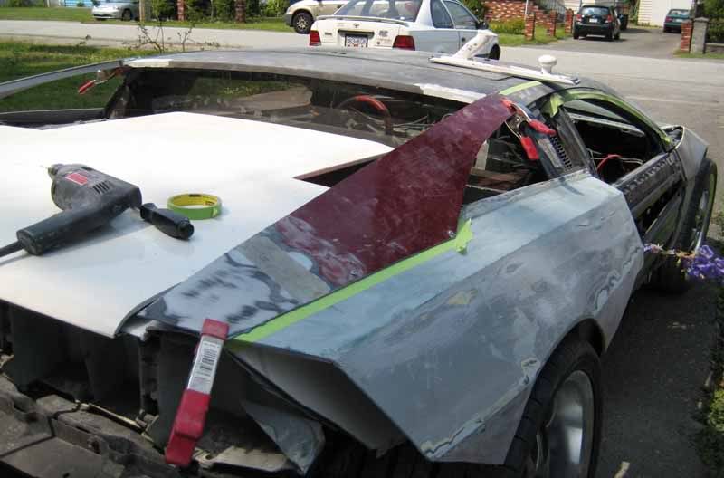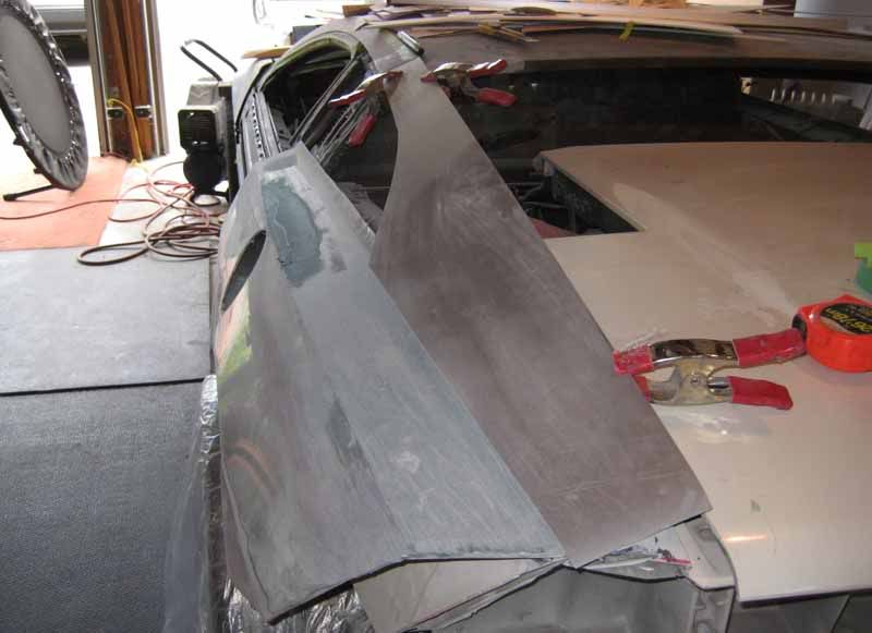 Back today's fun... Started to work on rear pillars, I'm using Fiero roof panel, template on roof panel and ready for cutting