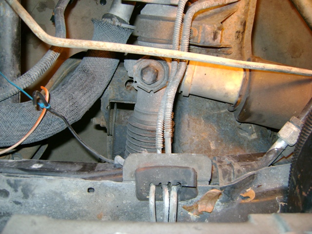 I went tout to the garage to start on putting in the cooler lines. It was a be itch as I thought it would be. I removed the spare tire tub for room and to be able to see what was happening as I threaded them in. At first I had the line on the wrong side of the steering shaft rubber cover thingy: