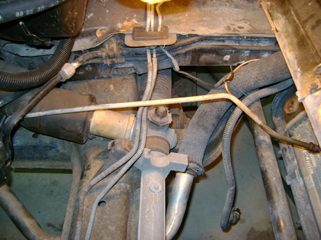 As the lower pic shows the line is inboard of the steering shaft. I had to take it out and thread it between the frame rail and the steering shaft. Everything lined up pretty good then. Both lines threaded into the radiator the first time real easy. I love it when this happens[This message has been edited by josef644 (edited 05-22-2010).]
