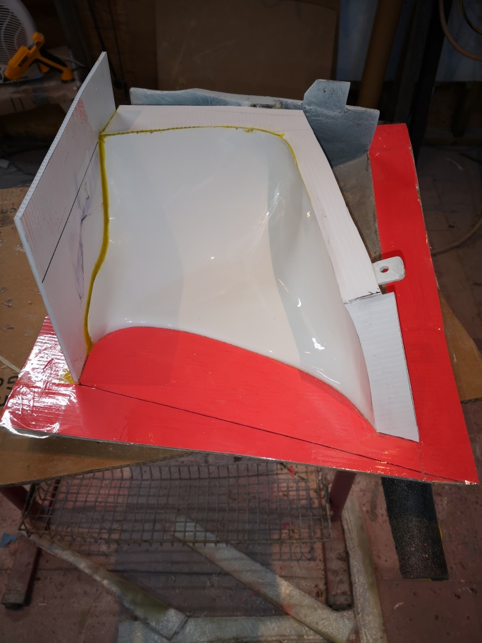 I cleaned up the top side and flipped the mold over to do the last pieces. after looking at it I think I can get away with finishing the intake ,wheel well and bottom of the back (all the orange areas) in two pieces.