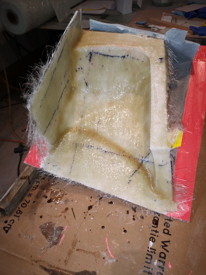 this shot is with the first layer of 1 oz glass mat the witness layer of white gelcoat shows thru the glass