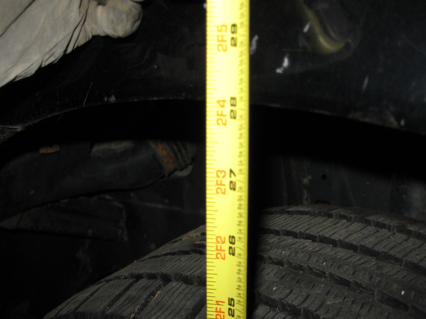 With 6 1/2" between cradle and floor (1/4" higher than stock ride height specified in Bloozberry's drawings) or 28" to center of wheel well opening:
