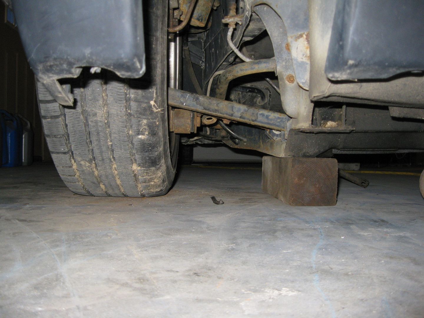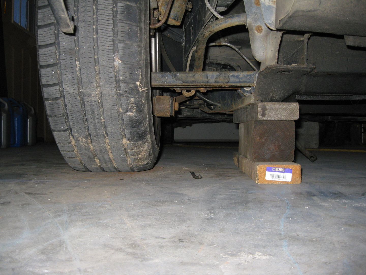 With 5" between cradle and floor (1 1/4" lower than stock ride height) or 26.5" to center of wheel well opening: Stock (lateral links already pointing up to the wheels)