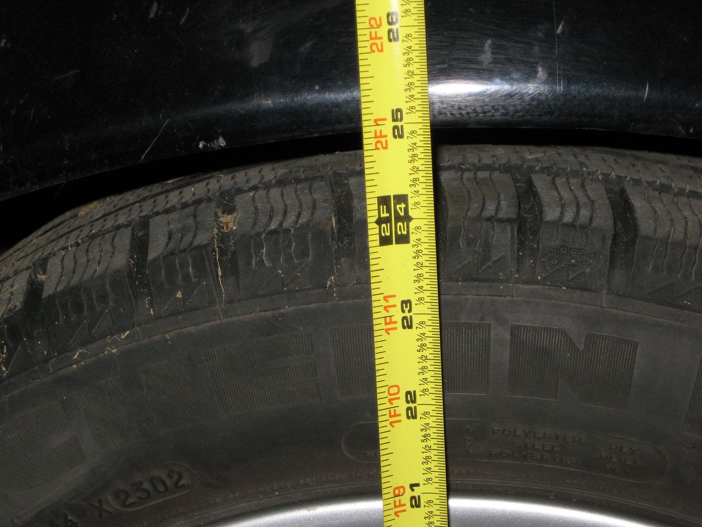 With 3 1/2" between cradle and floor (2 3/4" lower than stock ride height) or 25.0" to center of wheel well opening: