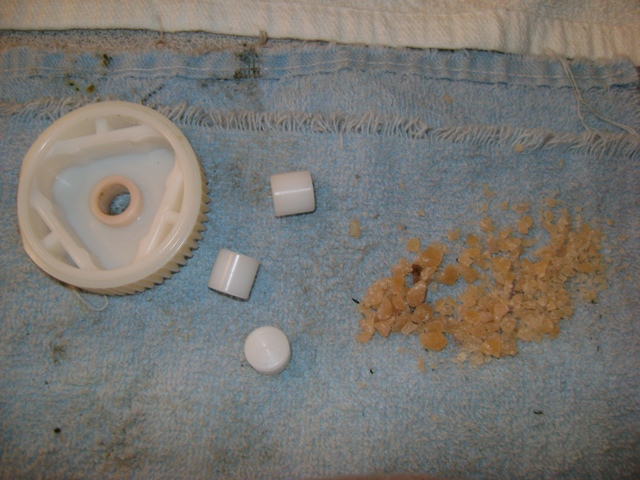 Here is a picture of the three white 'plastic' bumpers that disintegrate beside a pile of crumbled up wasted pieces. The passenger side motor was a bit harder than the driver side, but after rebuilding two 84-86 motors this was a piece of cake. Rodney's instructions were very good. I used the Vice Grip method of removing the gear.