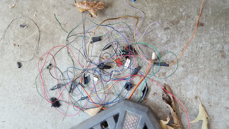 The easy stuff first. As Mike dug into the wiring (messy crap from the aftermarket stereo and speakers, radio harness), I traced and removed the wiring that was left from the aftermarket alarm system. It was pretty amateur. Twisted together and bound with electrical tape. Nothing was even soldered. Mike said that some shops will even do crap installs like that because it's fast.