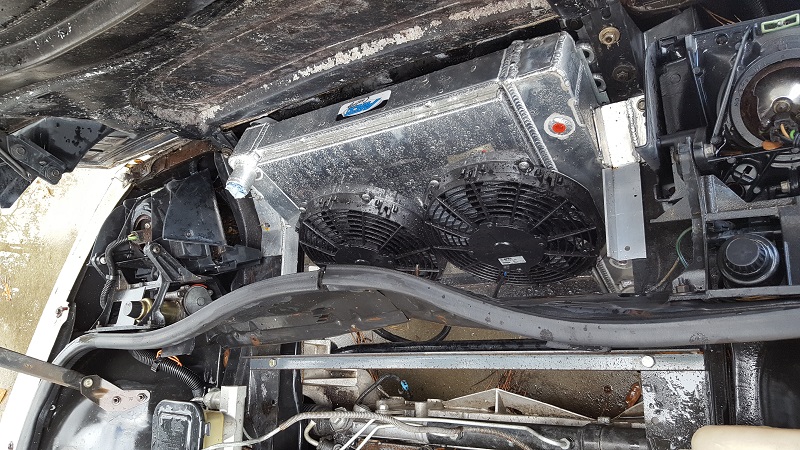 Mike has been busy doing mock-ups and modifying things. My awesome new radiator had to be tweaked, and will require one more tweak. The filler cap made it SLIGHTLY too tall, and it wouldn't clear the hood. He had a small piece of aluminum that was the right thickness, but had two small holes in it. He filled in those holes, removed the filler cap, and welded it over. He also modified the lower tube to clear the sway bar so it can connect up easily.