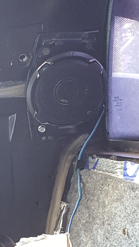 While on the topic of speakers - I went to put in the new 5.25" speakers that Crutchfield said would fit the B-Pillars, they even recommended a set of adapters. The adapters didn't quite work as intended. Some of the holes are cut almost like they're for keyholes, but not orientated right. This is NOT the final setup. I'll try to find a screw with a 'shoulder' so I can get rid of the washer, or trim it down, on the side with the shroud.