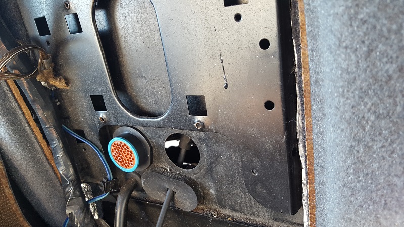 Mike had me get a particular type of wiring harness connector - two sets of them, one for the front firewall and the back. They are pretty nifty, you pin them, wire them, and they press together and have a screw-down sleeve. Plus, they fit almost perfectly int his space! With a rubber grommet, they'll be snug.