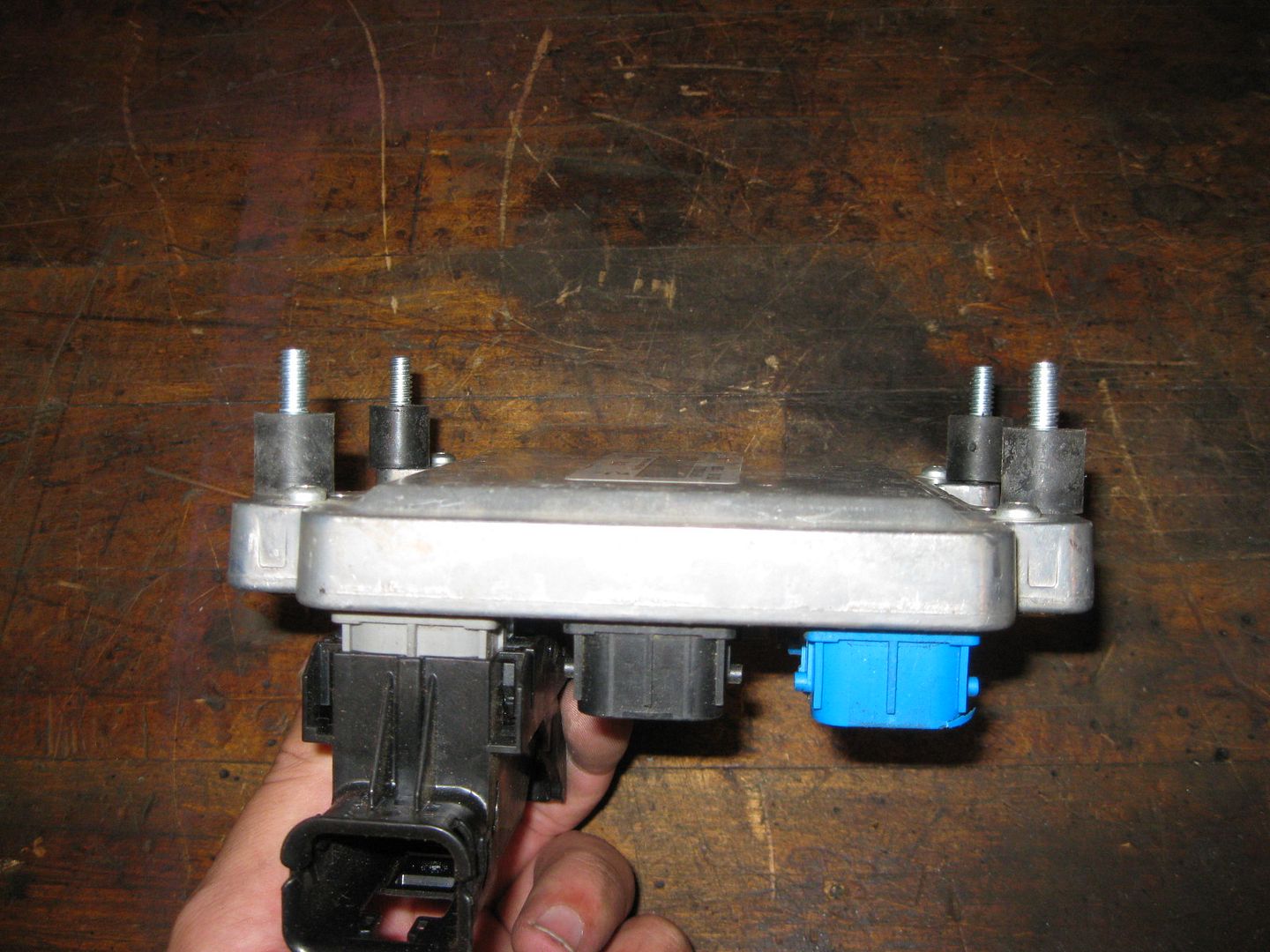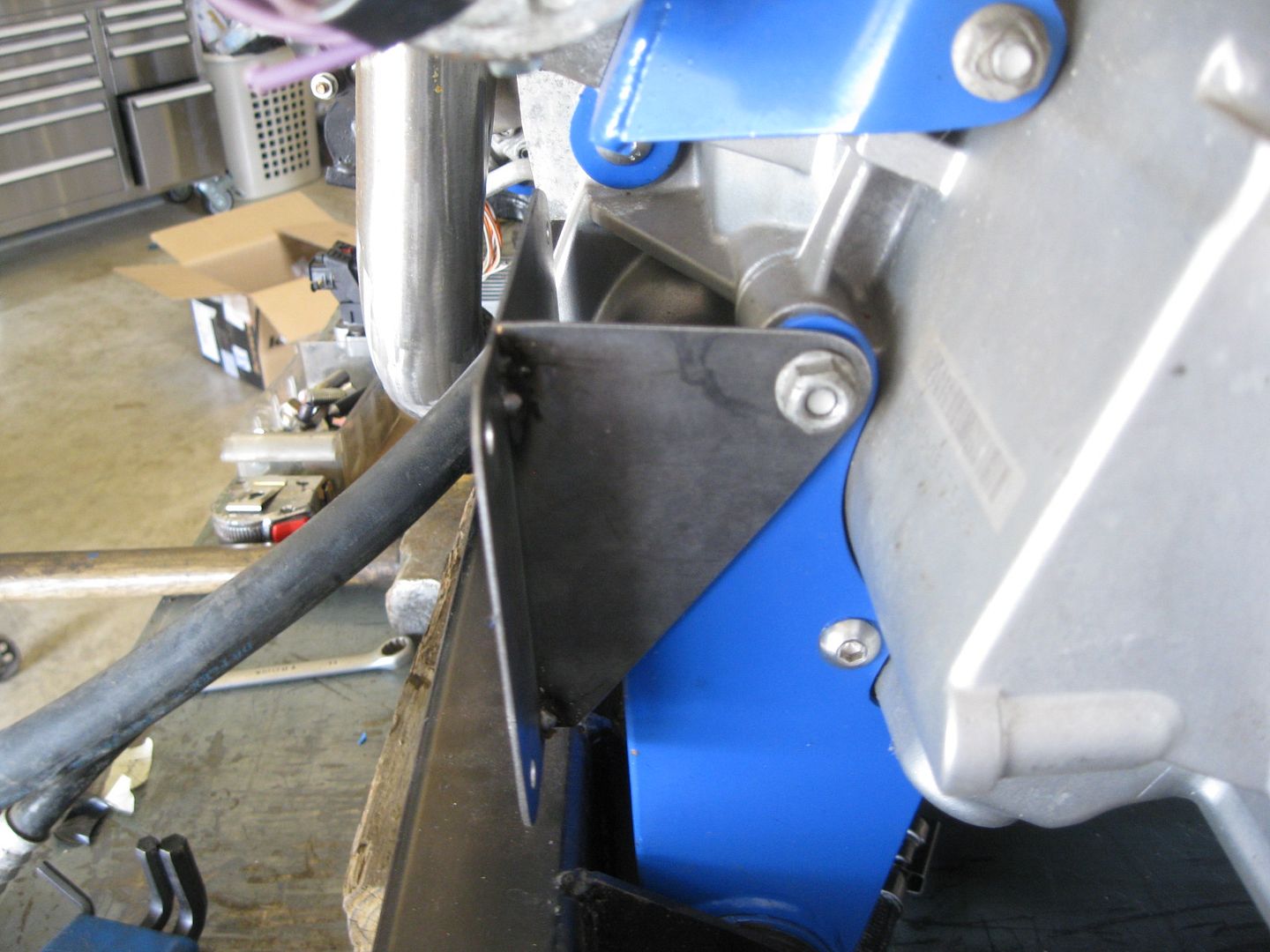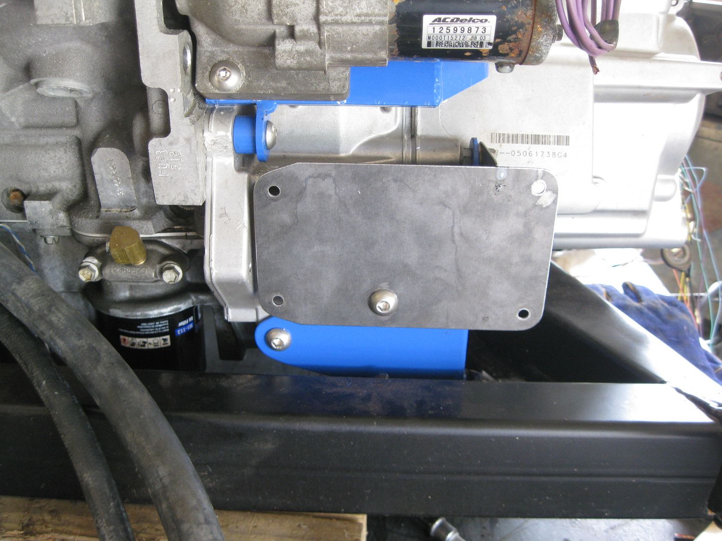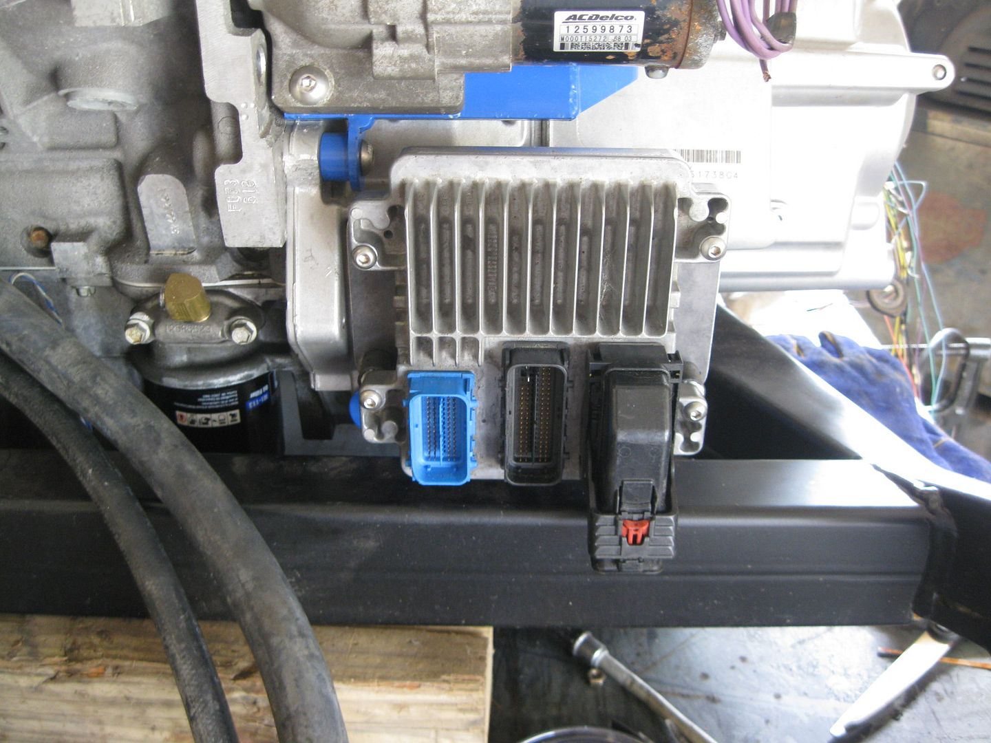 I was able to fab up the ecm mount today. It uses two of the front transmission mount bolts and has spacers between it and the blue transmission mount. The rear tab is just tack welded in the place for the pic: