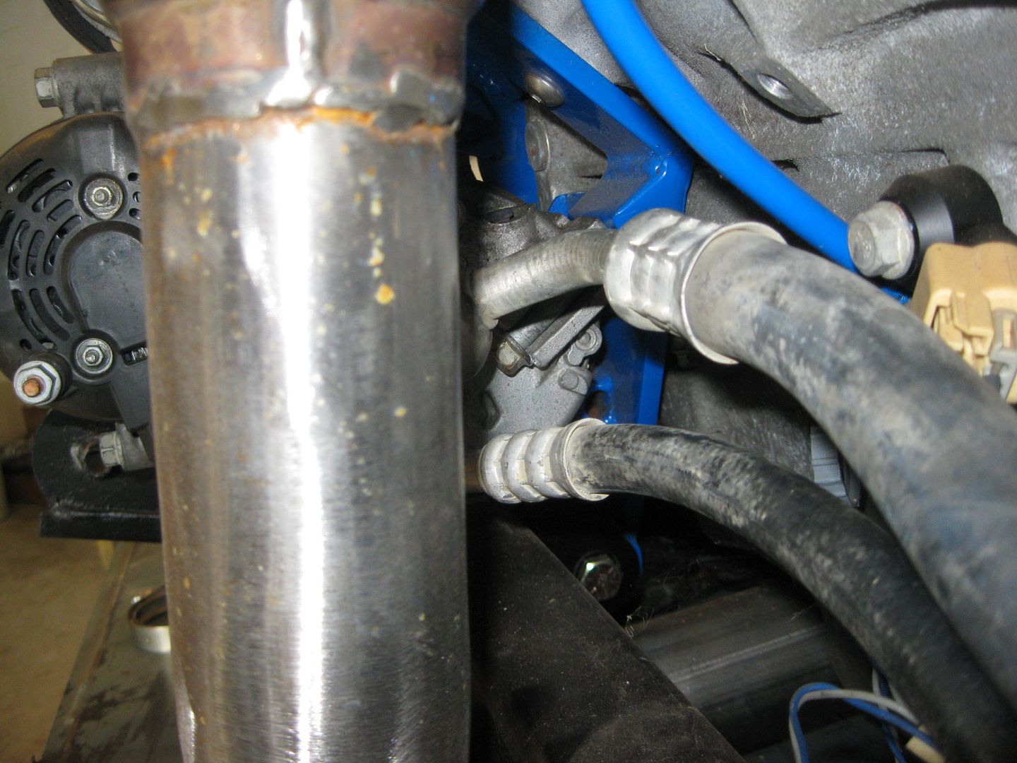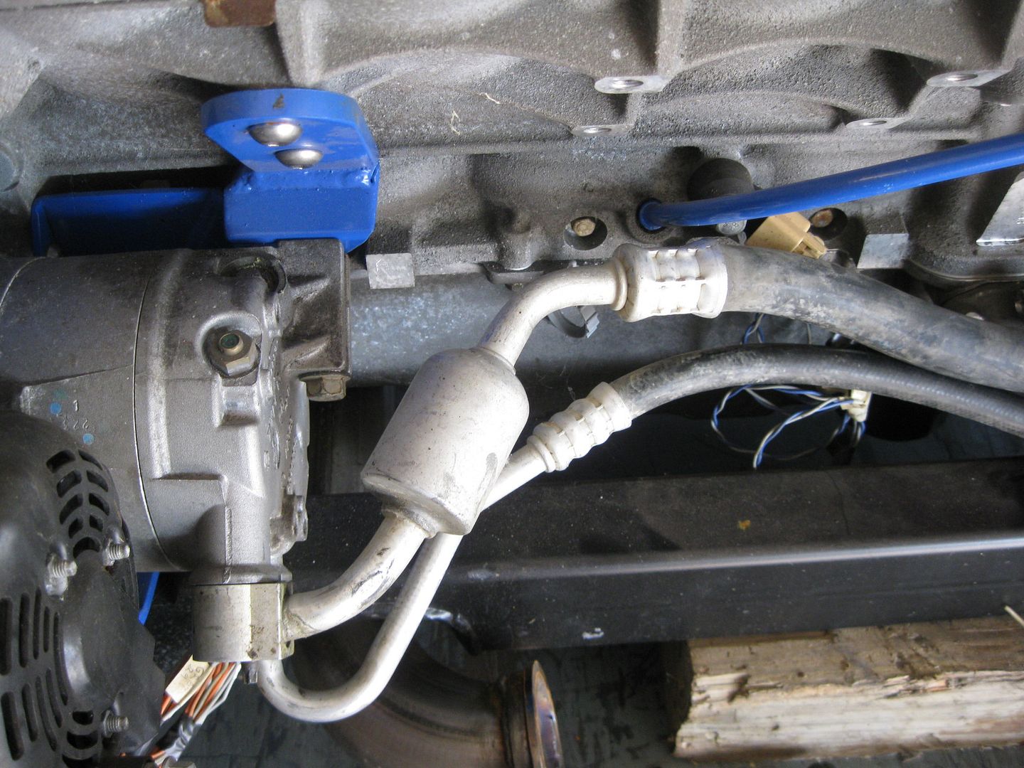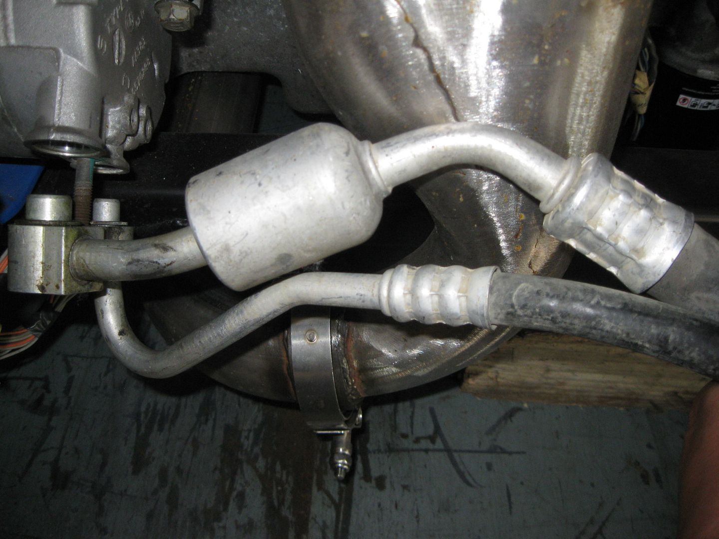 Then I started to play with the AC hose connection at the compressor. I knew it wouldn't clear the exhaust in stock form, but suspected that with some gentle massaging I could make it clear: Before: