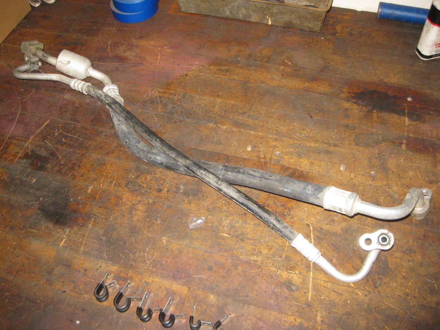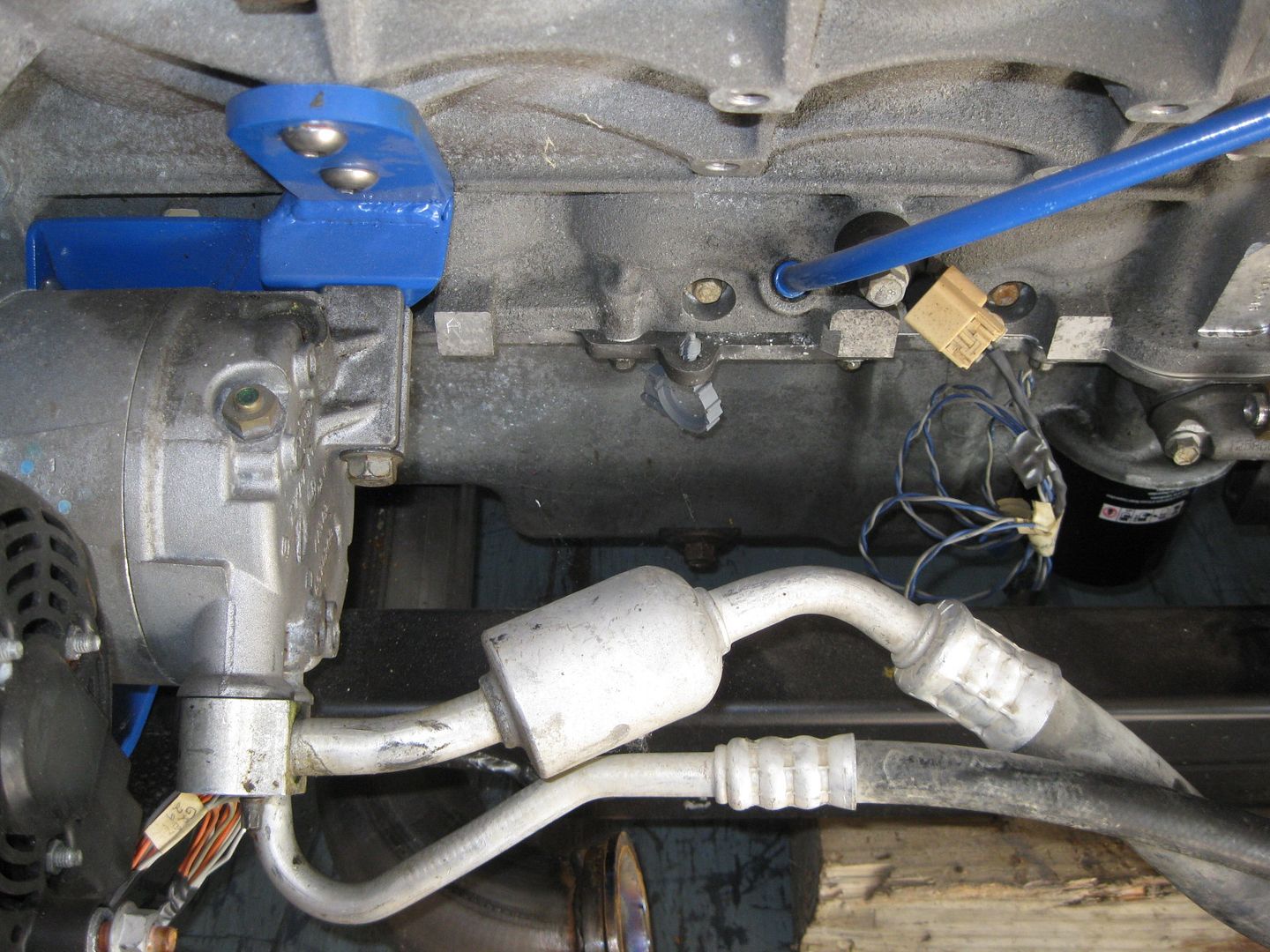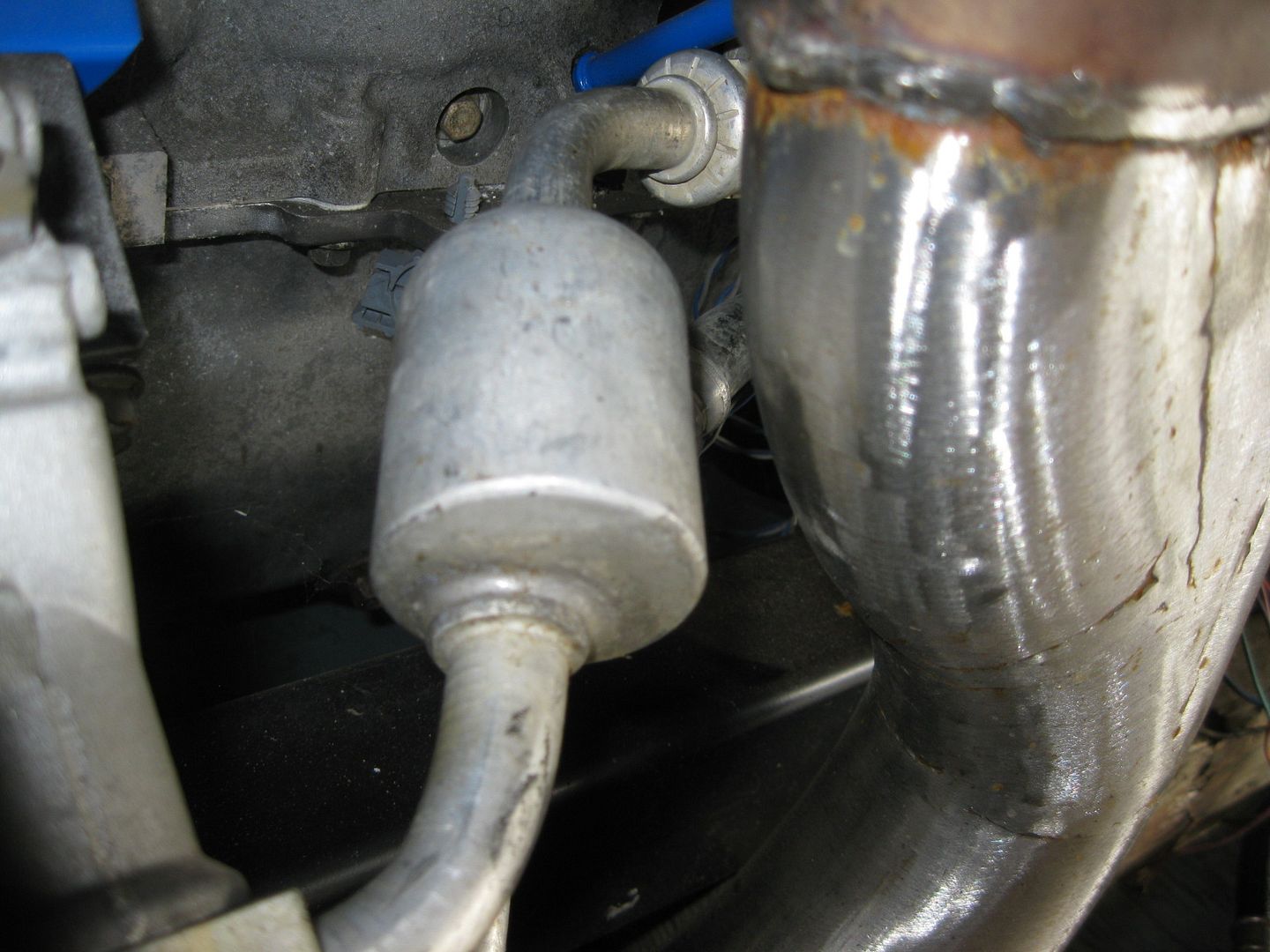 Then I started to play with the AC hose connection at the compressor. I knew it wouldn't clear the exhaust in stock form, but suspected that with some gentle massaging I could make it clear: Before: