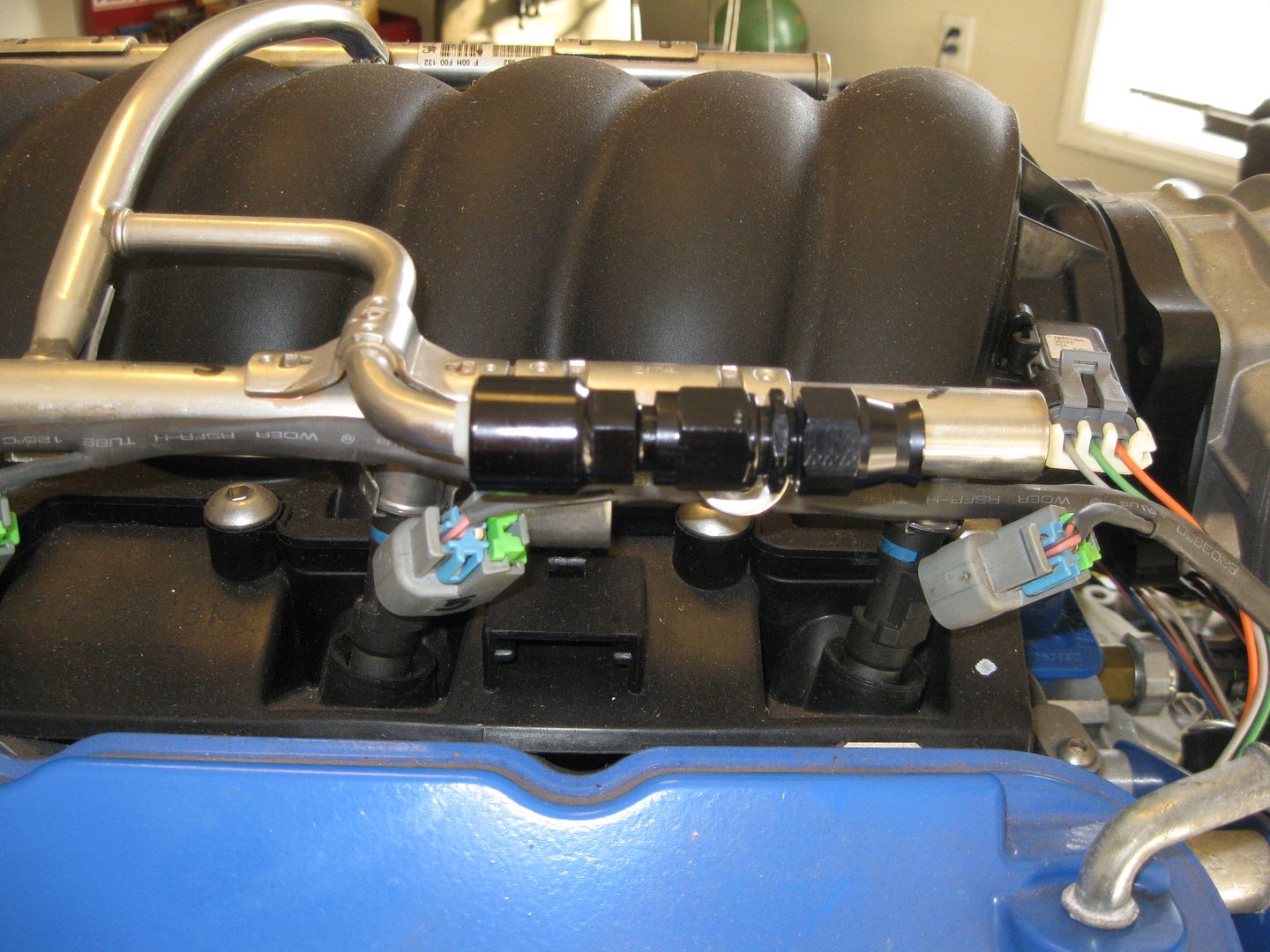 Connection at the fuel rail - GM quick disconnect to -6 AN (the 2nd picture also shows the -6 AN hose end installed):