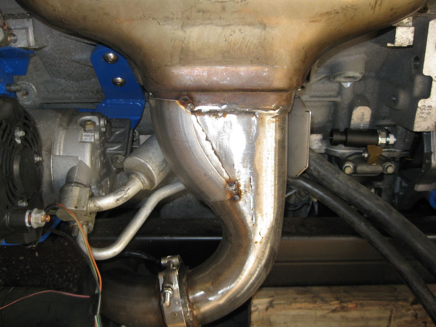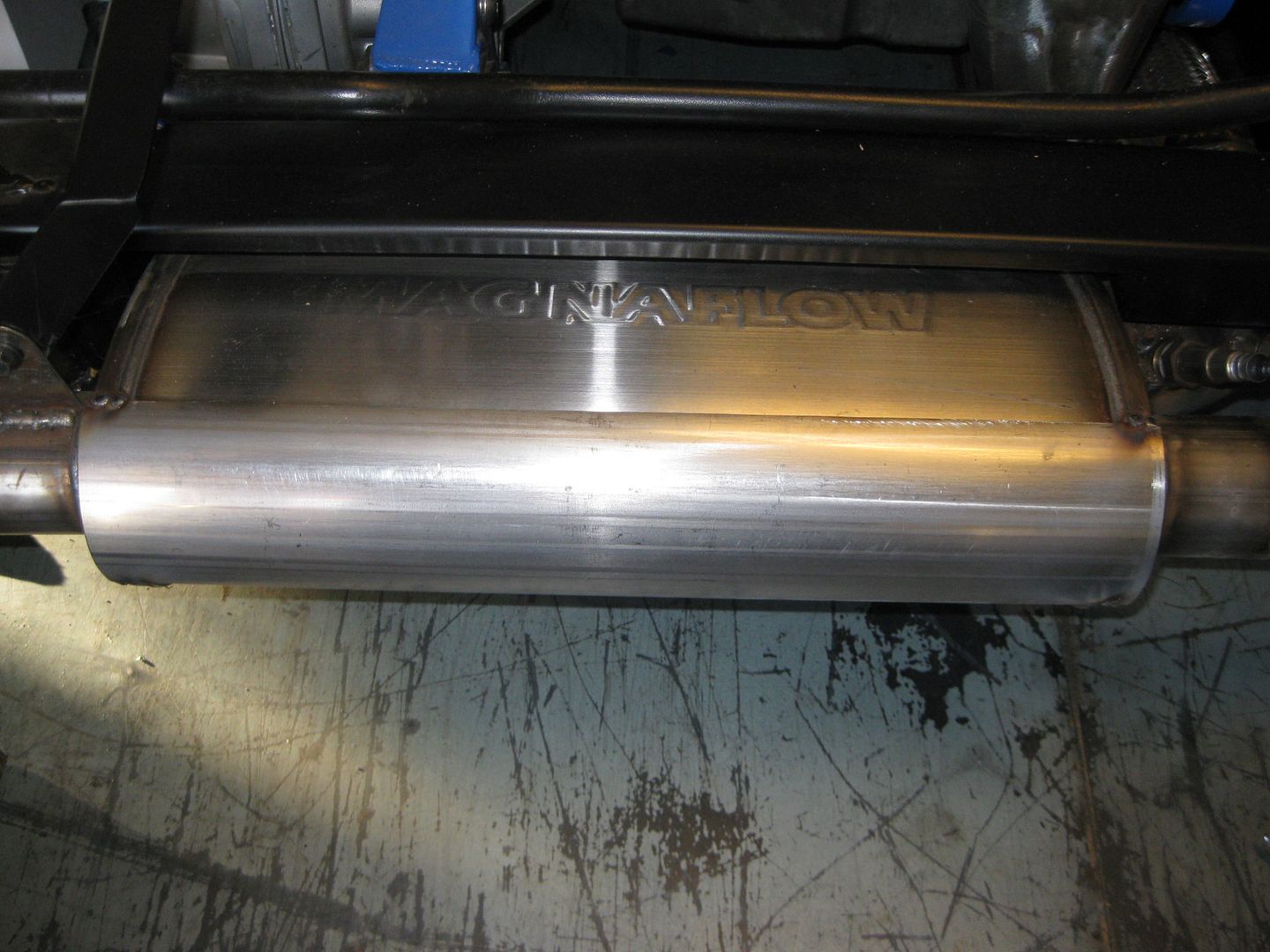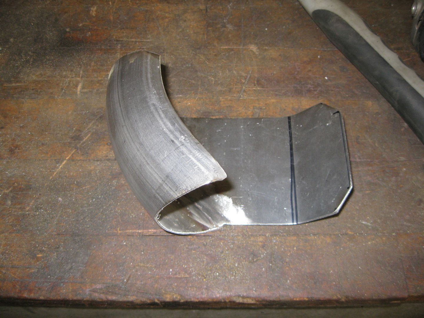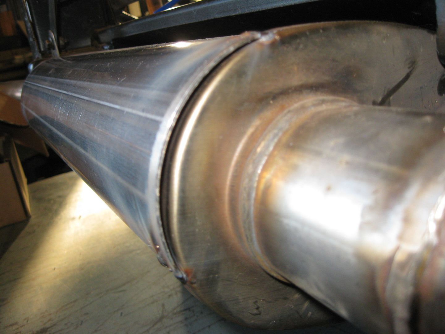 The 4" diameter stainless exhaust tube arrived a couple weeks back, so I cut it to the needed shape for the heat shield between the muffler and the trunk and welded it to the muffler: