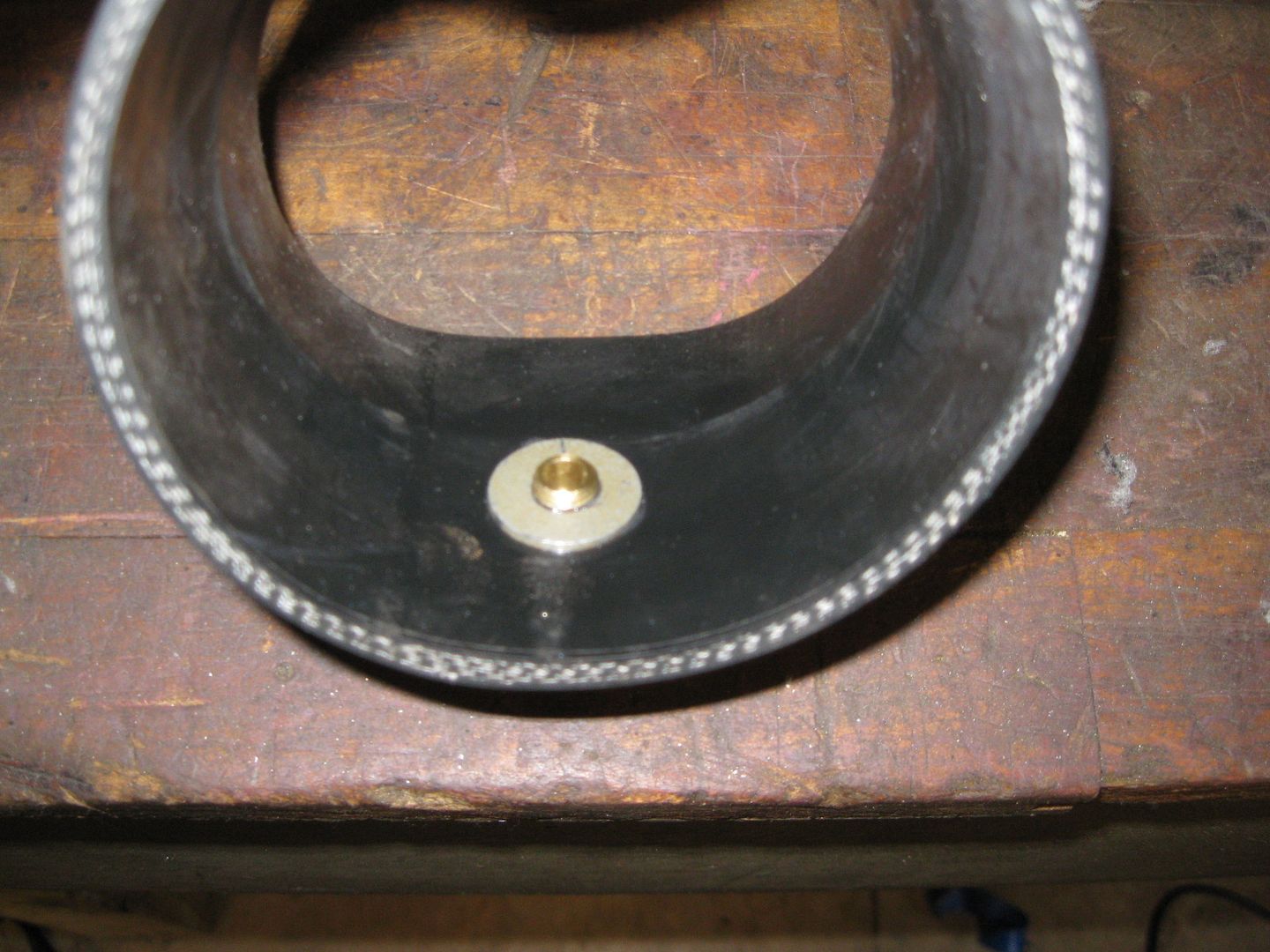 Since I am using a silicone sleeve between the MAF and Throttlebody, I needed to drill a hole and put in a hose barb fitting. I ended up taking a brass 90 fitting, found a washer that would slide past the threads and another one that didn't. Then I tapped the ID of the washer so it would become the nut for the back side. I used some RTV (between the washer and silicone sleeve) and loctite (on the threads) to ensure the washer won't come free and be ingested by the engine.