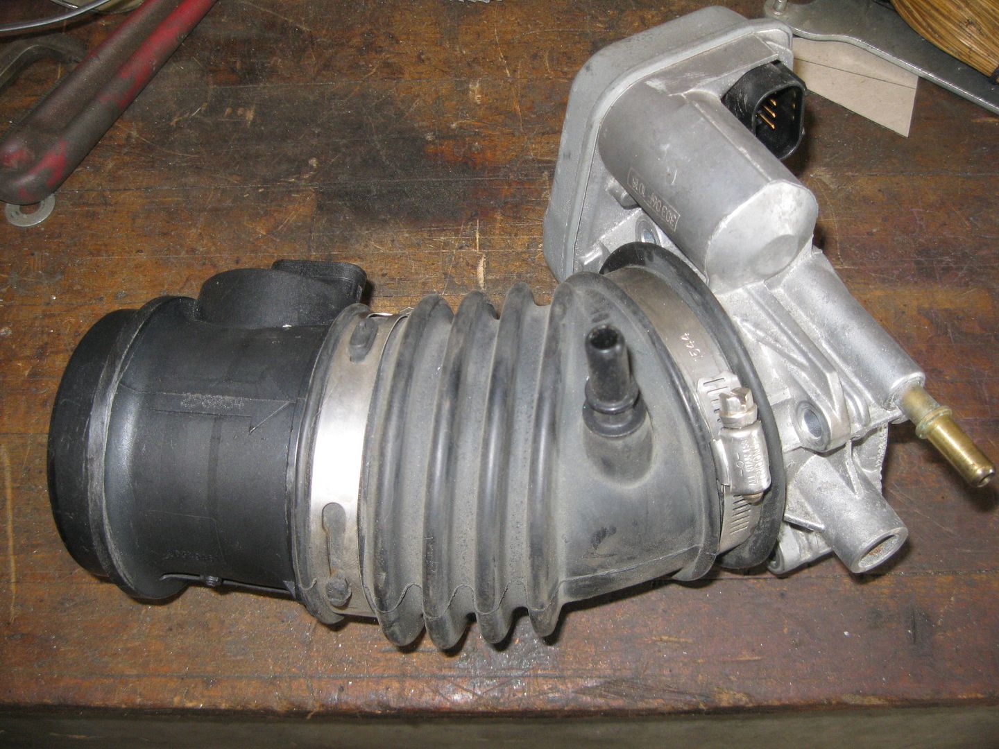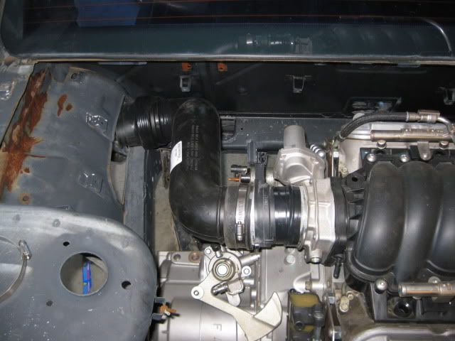 The last thing I messed with was the plastic air intake tube. I cut off the OEM expansion section and added the 90 degree elbow. Here is an old mockup pick, notice I just taped the MAF to the TB and the expansion portion was fully collapsed and wrapped with electrical tape.
