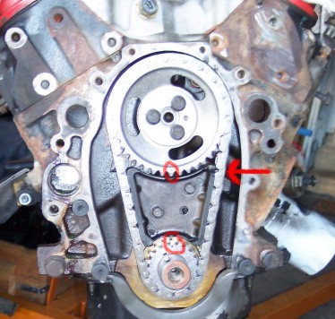 The lower gear is pressed on using the original center bolt and a collar. The timing gear sprocket is screwed on to 20 ft lbs and the dots top and bottom must line-up (see circles).