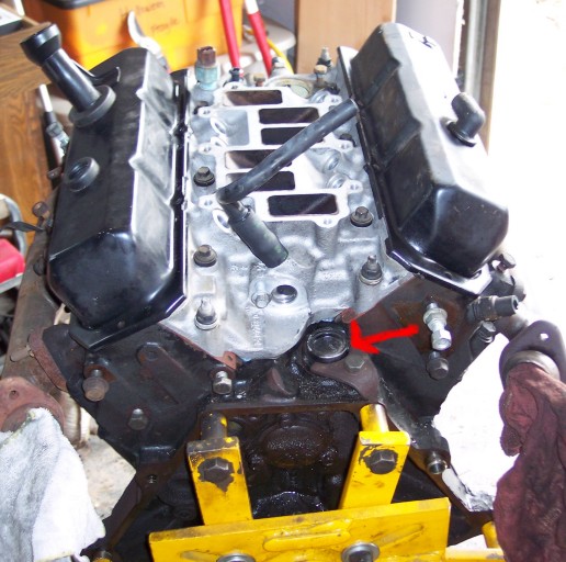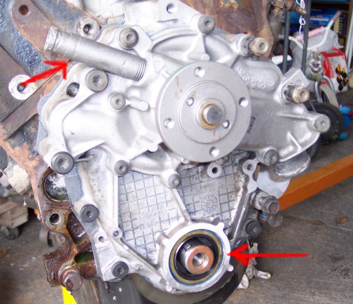 OK, moving along I cleaned-up the timing cover (sans the timing guide plate) and installed it with a new gasket and some RTV. Then I added a remanufactured water pump ($16 at O'Reilly's). The price is great but you have one problem, the '88 didn't have the water outlet on that was used in earlier L44 motors. So you have to use a pipe wrench to get it off and you will trash the threads when you do it. So I had to tap the hole and use plenty of pipe thread tape on the cap, but it works. I also added a new front main seal.