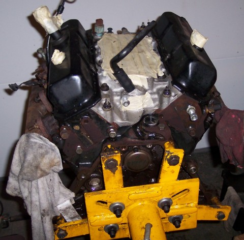 Finally, I took some old parts I had from my last 3.4 swap and put them on the engine. I use them as cleaning and painting masks; oil pan, valve covers, timing cover, disty plug, oil filter, various bolts and rubber plugs. I even have a set of crappy old spark plugs that have about 5 layers of paint on them by now.