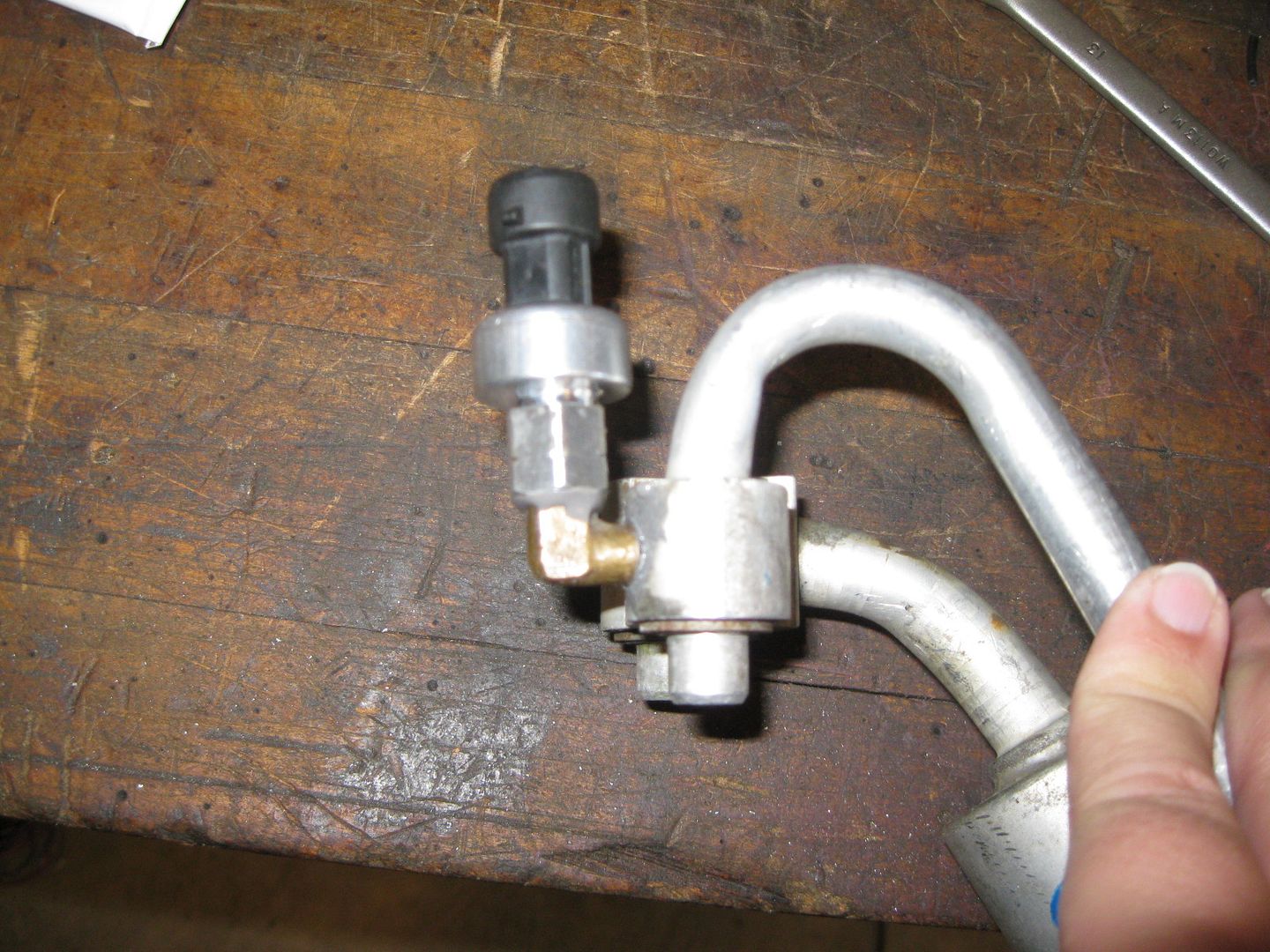 Installed the A/C pressure sender for the ECM. Found a brass fitting with a 1/8 NPT on one end and used a M10-1.5 die to rethread the other end. Then it was a matter of drilling/tapping the high side fitting at the compressor. I coated the threads with JB-Weld before threading them in to help ensure a leak free seal.