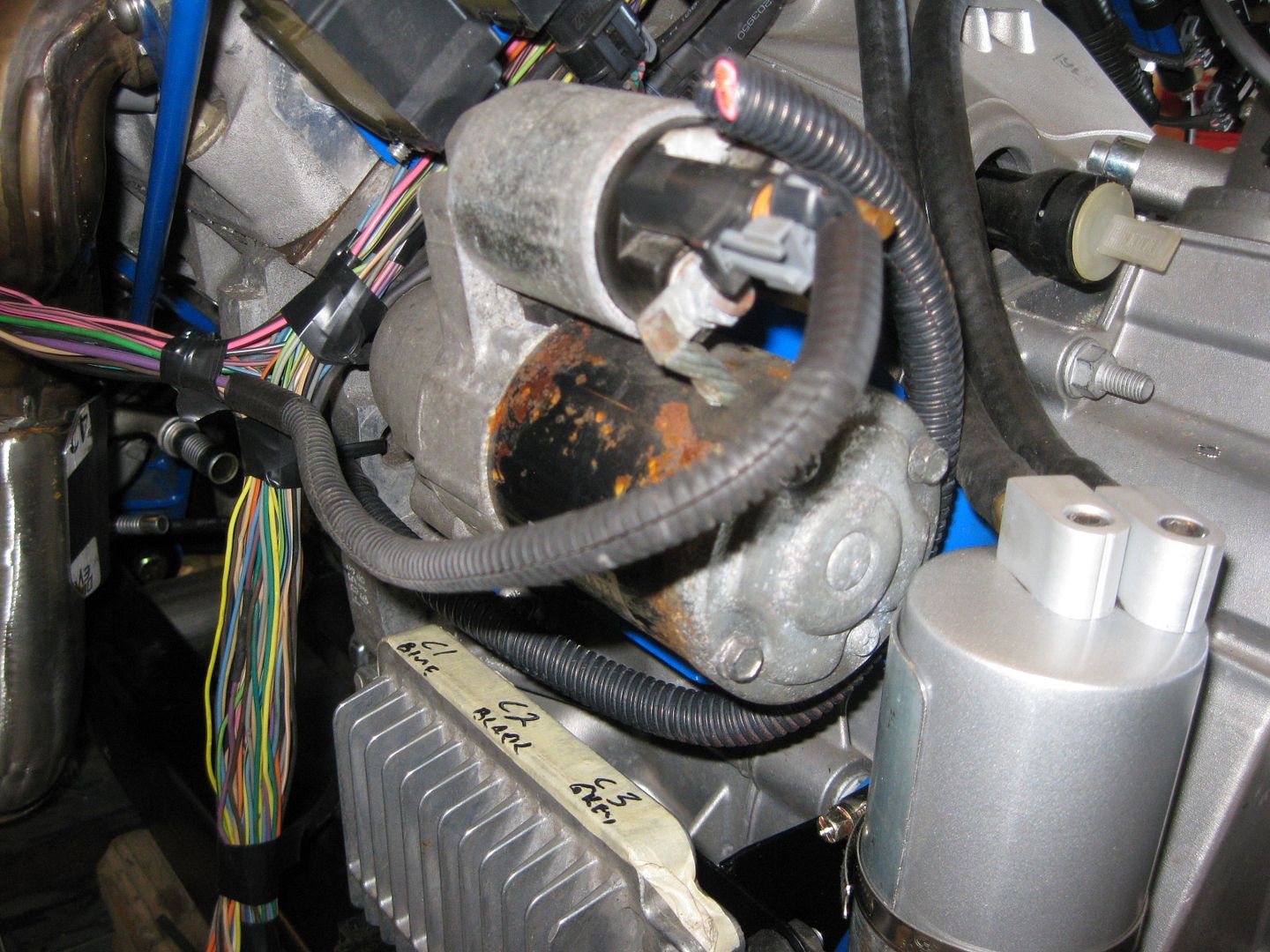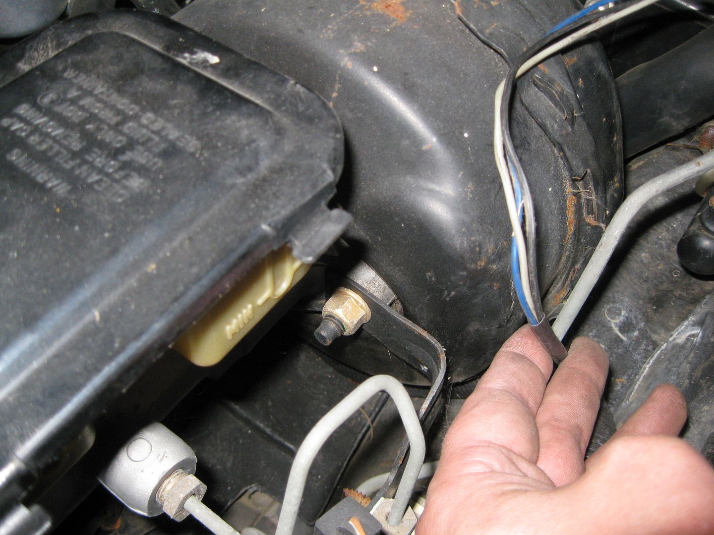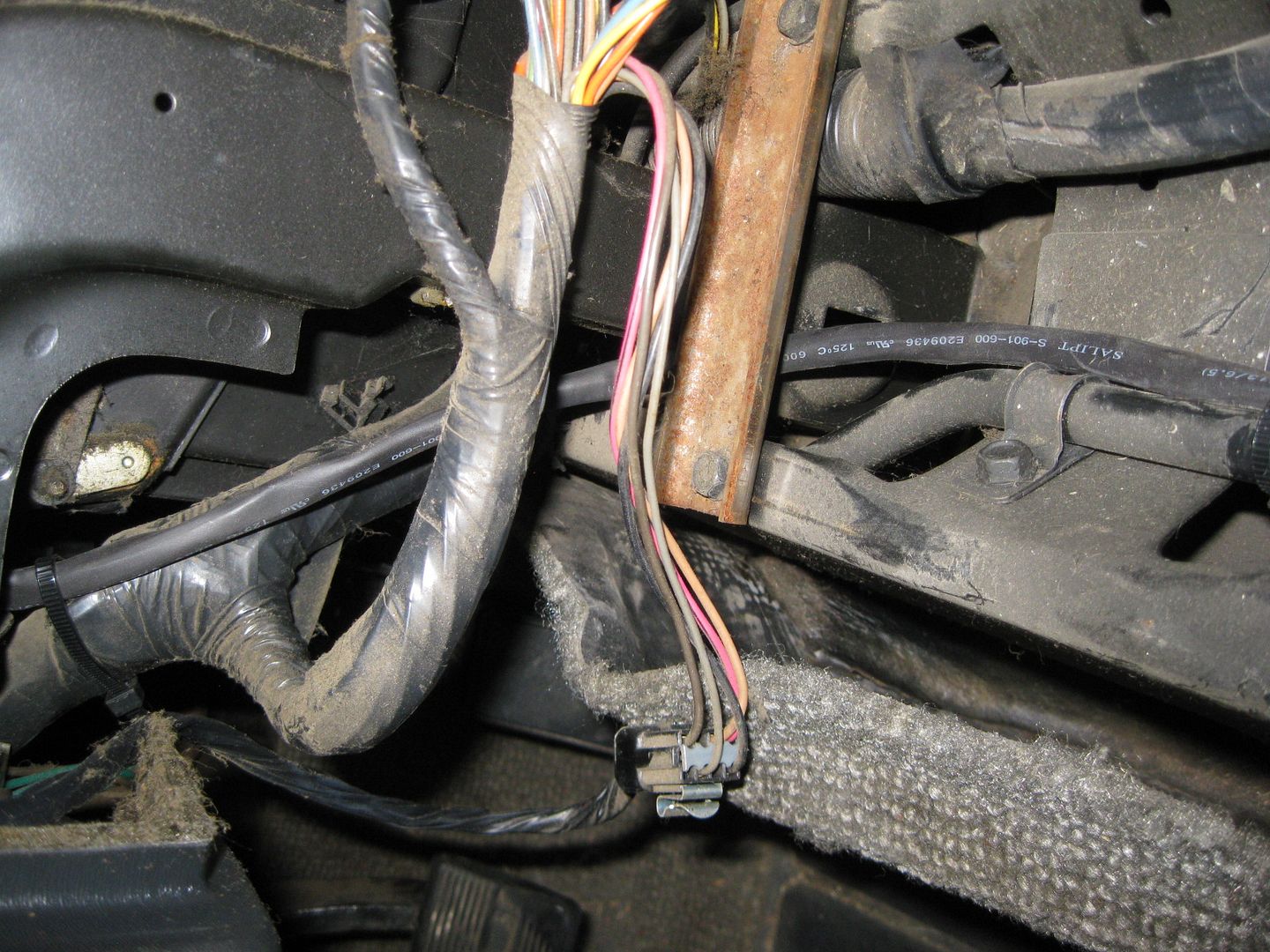 It is hard to see in this picture, but the harness comes through the firewall and goes under the C100 and under the brake booster to the other side: