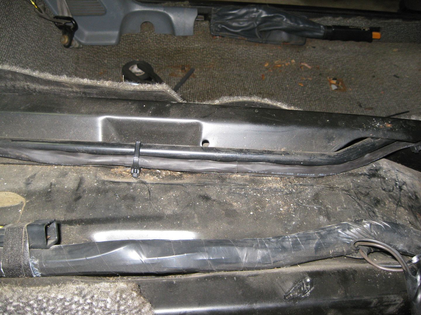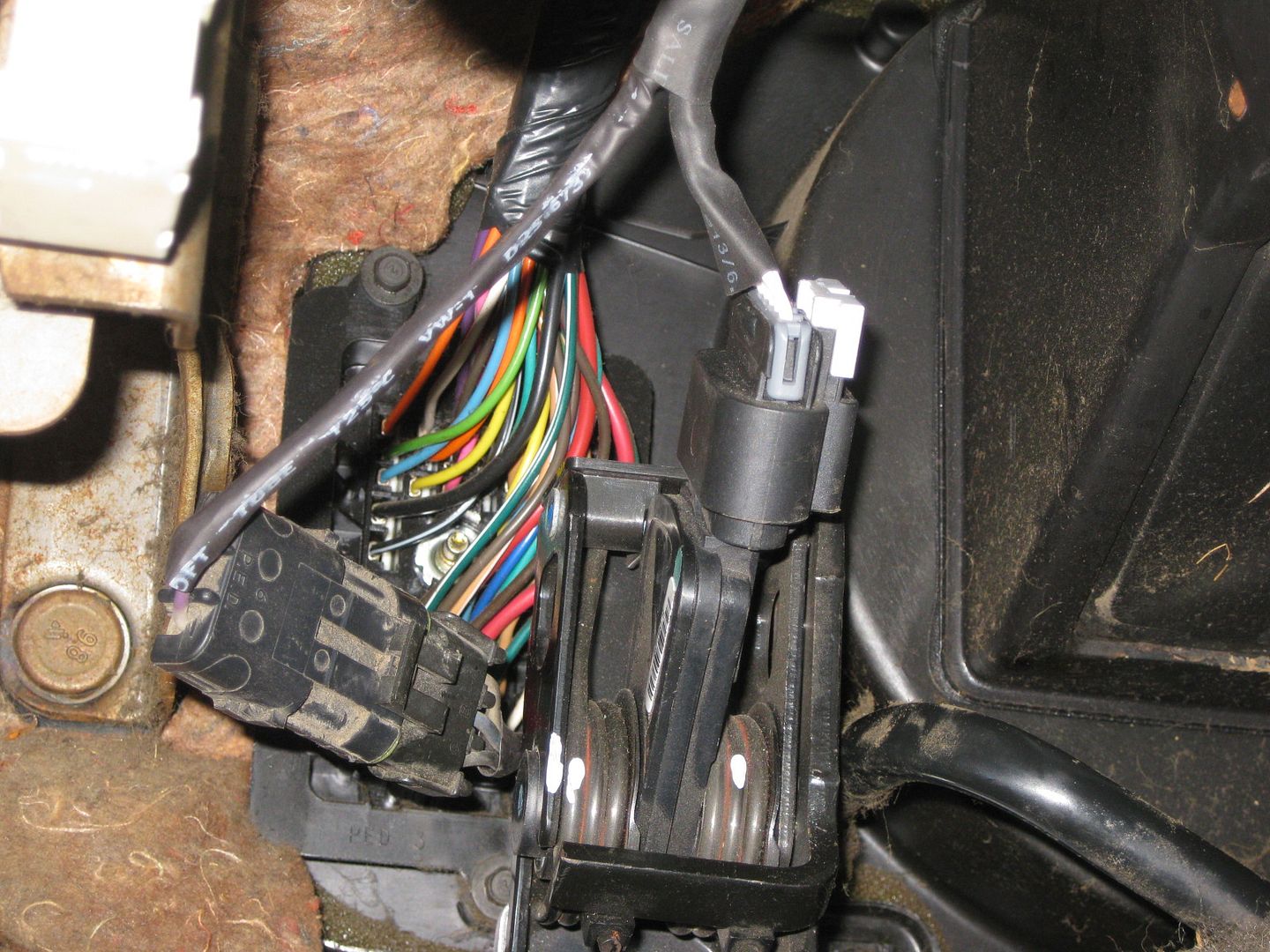 Back inside, the pedals were installed again and the jumper harness connected and routed through the center console area: