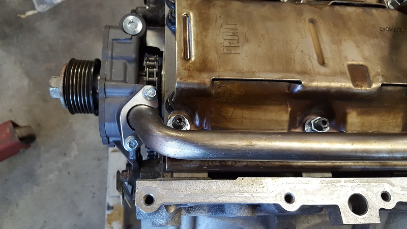How we got there was the fun part. That "lower" hose you see in the picture is a custom hose. The hose which connects there on the Toyota made the MR2 Spyder 2nd Gen was ... bizarre. Probably to help keep it cool, it looked a lot like a giant bobby pin. It would have been a hassle to connect, and looked out of place.