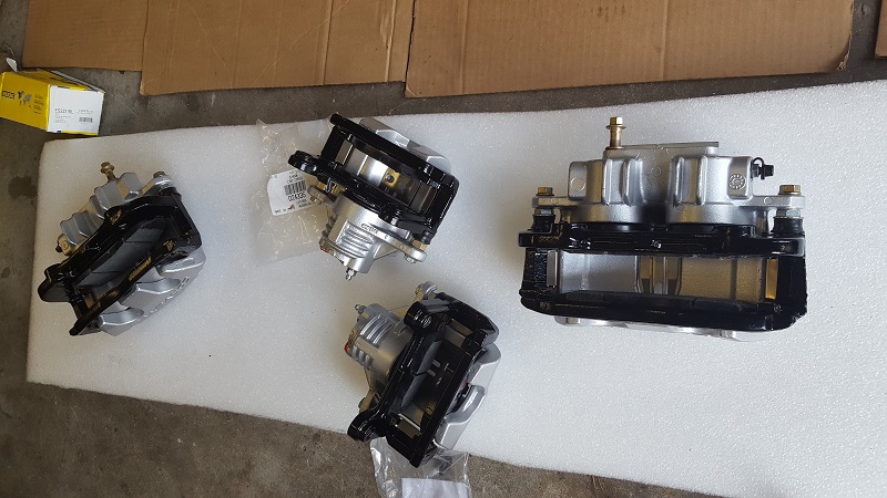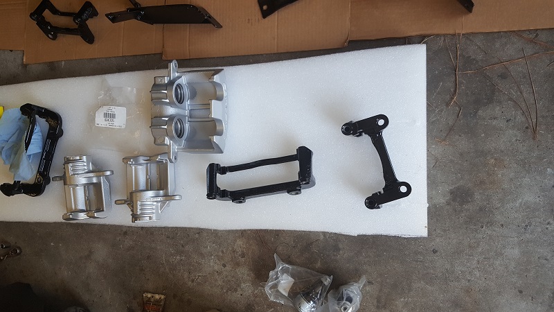 Here's a shot of the bakes, still disassembled and then assembled. I wanted them to have some contrast and pop. So the calipers are silver, and there looks like it has a light mettalic mica in it. The brake brackets are glossy black.