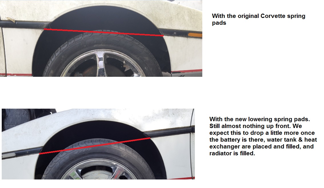 The top picture is back when Mike had mocked things up, and the mounting plates were just tacked into place. The front suspension still had all used stuff, including the stock adjustable spring pads. So I bought a new set of 'lowering' spring pads, which are advertised to bring the Corvette down about an inch. You can see the difference that's there already.