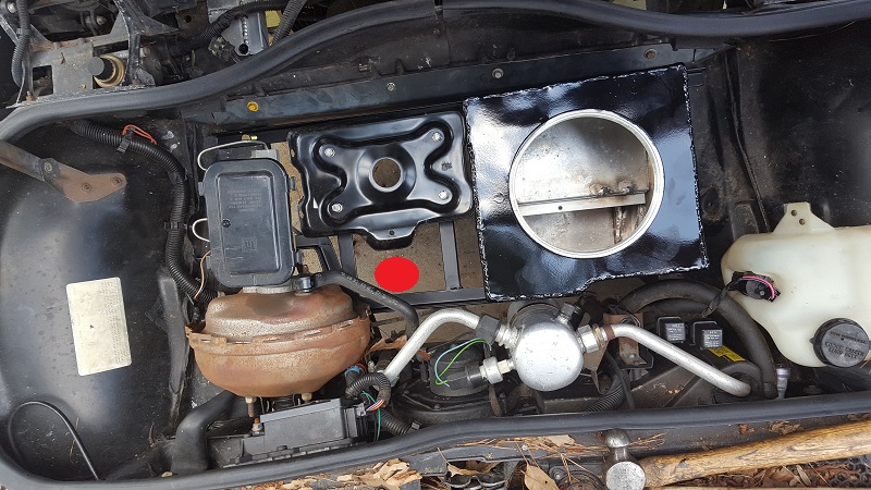 We also did some other test fitting with the powdercoated support frame of the new frunk, where the water tank for the intercooler would mount, battery track and the ECM bracket. The 'red dot' you see is to represent a hole that exists in the frunk floor (also still needs to be coated), the power steering resevoir will 'float' up in that hole. Some soft rubber liner will go around the sheet metal to protect things and seal it off from water splashing up through it.