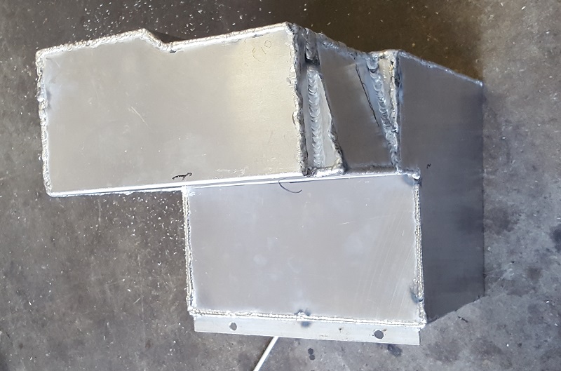 What the pictures will show is the custom water tank pieces and tack-weld-for-fit pictures of it. One of the pictures also captured the new "floor" in the "frunk" during the test fit pictures. Eyeballing the tank, I think it'll hold 3 to 3.5 gallons. Mike wanted it closer to five, but only so much room to work with, which he maximized!