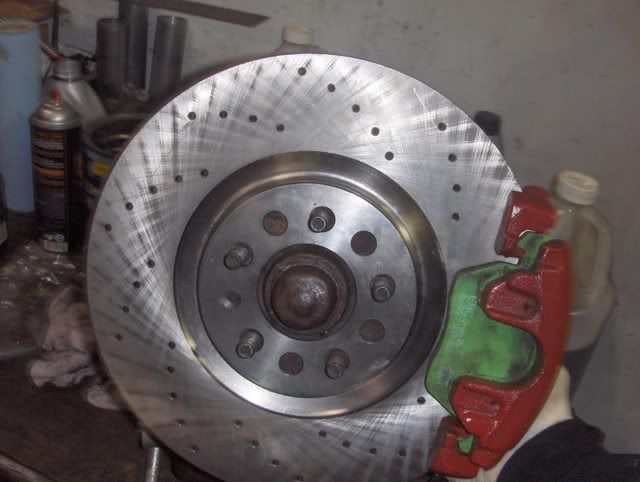 Here is a teaser pic of what I am working on for the VR6. I still need to aquire a hubcentric ring and make the caliper bracket, but it all looks do-able and pretty easy to accomplish. The rotor was not redrilled. That is the stock pattern for the Audi. Dave