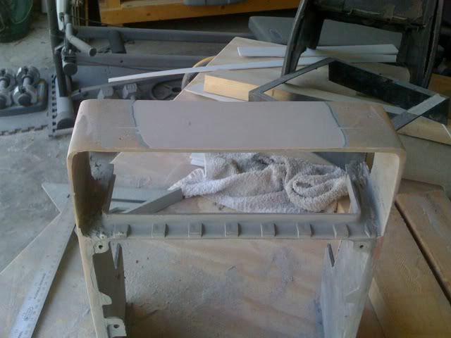 I am going to round out the top side of the gauge pod over toward the back and then round out the console sides under the dash itself. I'm also going to create a permanent cubby area in front of the radio. I'll then make the leap and permanently adhere the front radio and gauge faceplate to the console. I'll buy extras when i do this - I'm not ruining the originals. Why? Everything is perfectly lined up when the faceplates are bolted in - why not take advantage of this. I'll keep the bolt holes and nuts in place just to retain the look but sand smooth and paint everything to match. I think this is the way to go. Plus it frees up time from making a whole new panel from fiberglass.