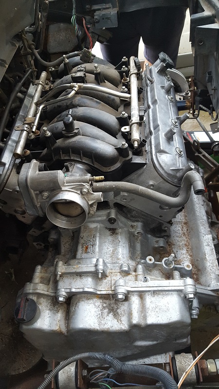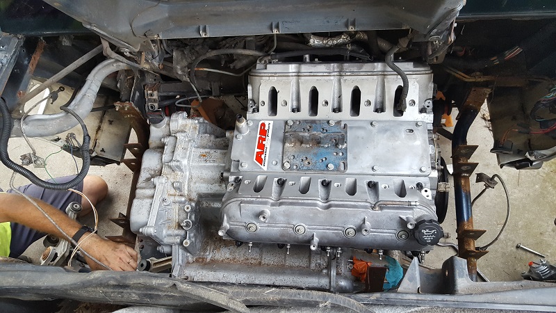 After the cradle was reconnected to the body, we put the OEM intake on to see how the fitment would be, and get an idea of spacing. It's pretty roomy! The decklid closes without any issues! There was around 2.5-3 inches of room between the intake and the 'beam' on the bottom of the decklid, and of course more room between the 'beams'.