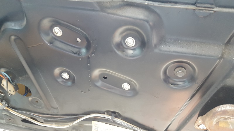 Once all of the MANY window adjustment bolts were adjusted ("with the window in the half-way up position"... quote from the TSB on adjusting the windows). we applied blue loctite one bolt at a time. All rivets that we removed were replaced with appropriate sized/length stainless steel hardware.