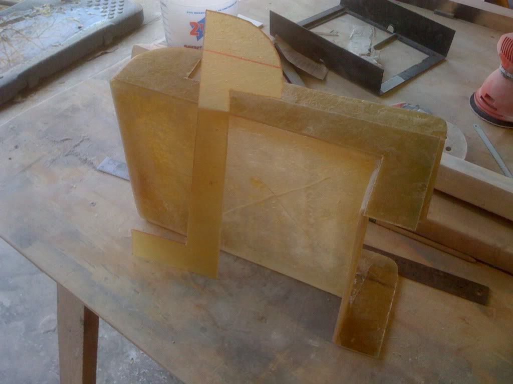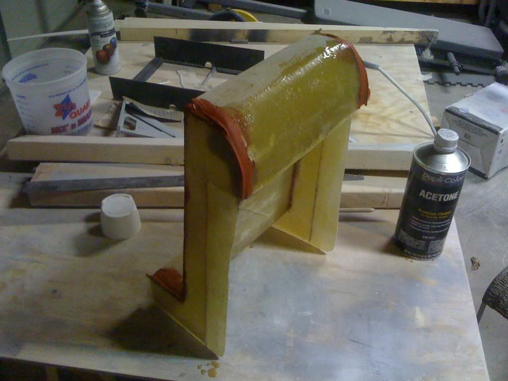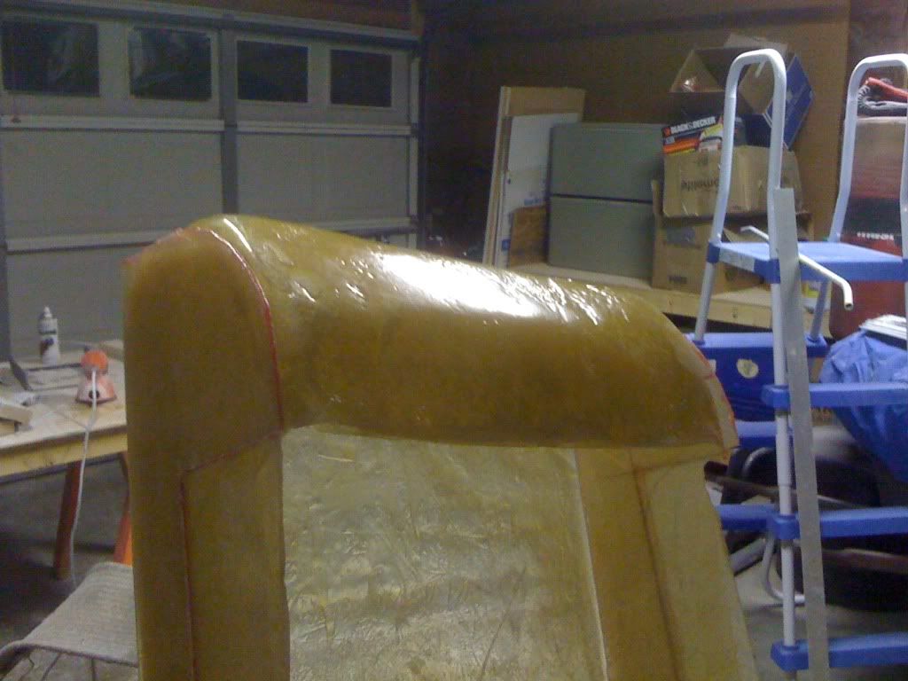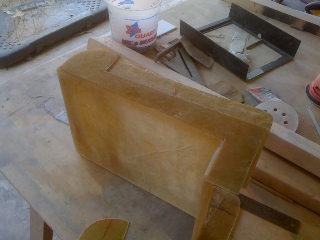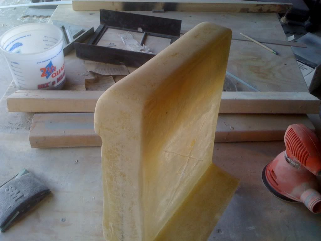 Once you have a good idea and understanding of your design then create your fiberglass panels. I would go 2-4 layers thick for the sides. And then use a hefty pair of tin snips to cut the fiberglass to your desired shape. And of course prepare for sanding... lots and lots of sanding. For the curve section I would create a panel with only two layers (use matte - NOT cloth). You want enough flexibility in the fiberglass to make the piece fit the curve but light enough to hold in place with either hot glue or tape. Once everything is in place use either resin and ONE layer of glass or body filler around the edges / side where the three pieces meet and let dry so you can then remove the tape / hot glue. You can then add additional layers of glass to the curve section if need be.