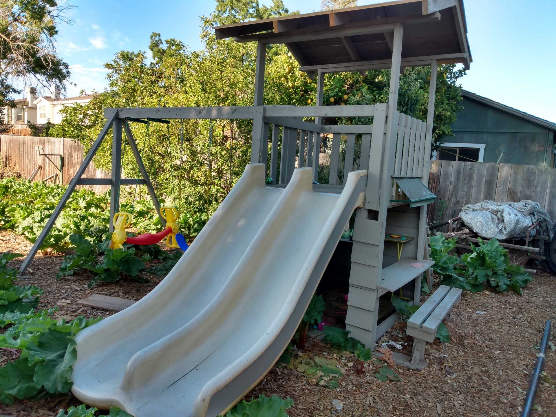 Wanting my kid to take advantage of the yuuge backyard we have, I ordered a brand name playset from walmart. Walmart sells them cheaper than the mfg! lol Showed up box after box week after week. Found instructions online and assembled the beam, legs and swingset, and had it hanging on the rear shed so my kid could use it. # weeks later still no more boxes. Went to home depot and made my own. Good thing because I had my important tools there, my truck was stolen that night. Had it done in one day, already ordered the swings and seesaw from ebay. 2 days later im in the lil toyota going to do a dump run and I see a huge double slide. Went and loaded the truck at the job, went back and threw the slide on top. Didnt have any straps or anything but it was heavy and had a lot of water in it. Bigger than the bed on the toyota lol, I drove home slow