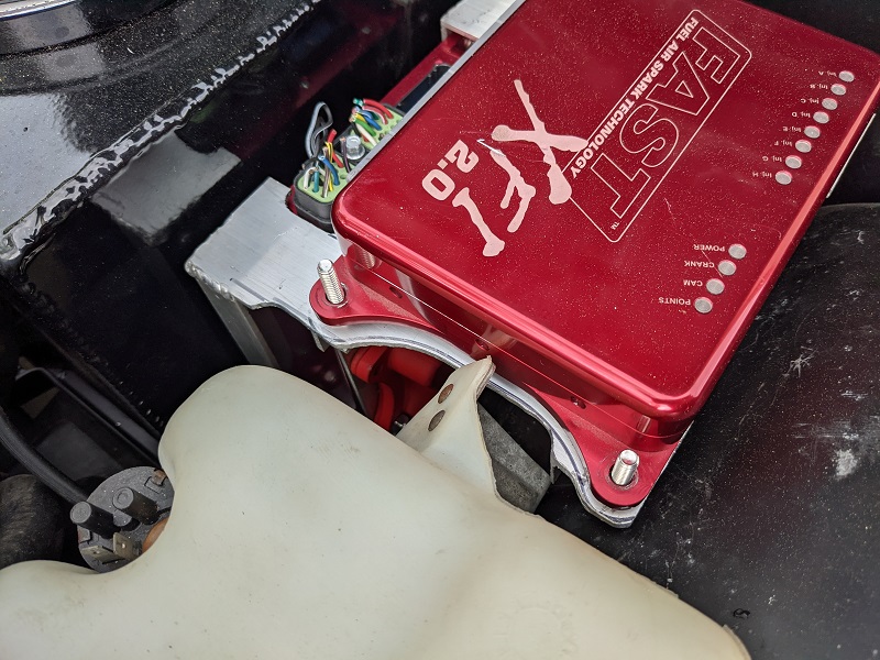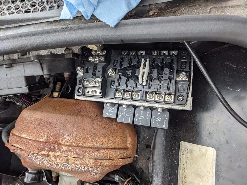 So the last few weeks was him building a bracket for FAST modules, and the fuse/relay box for the intercooler water pump, fans, the FAST and the EHPS pump. Ironically, the auto parts store only had three of the 'standard' automotive relays on the shelf, so we had to get one 'micro' relay. As you'll see, it actually worked out for mockup. The normal sized one wouldn't have cleared the booster.
