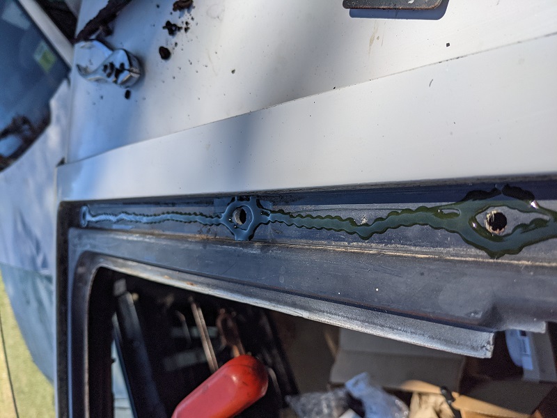 We used the 3M Super Weatherstrip sealant, one of the many things I got from the FieroStore for this. I got this shot after Mike laid the bead down for the rear rail.