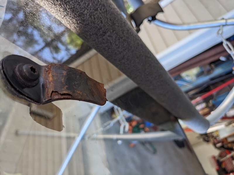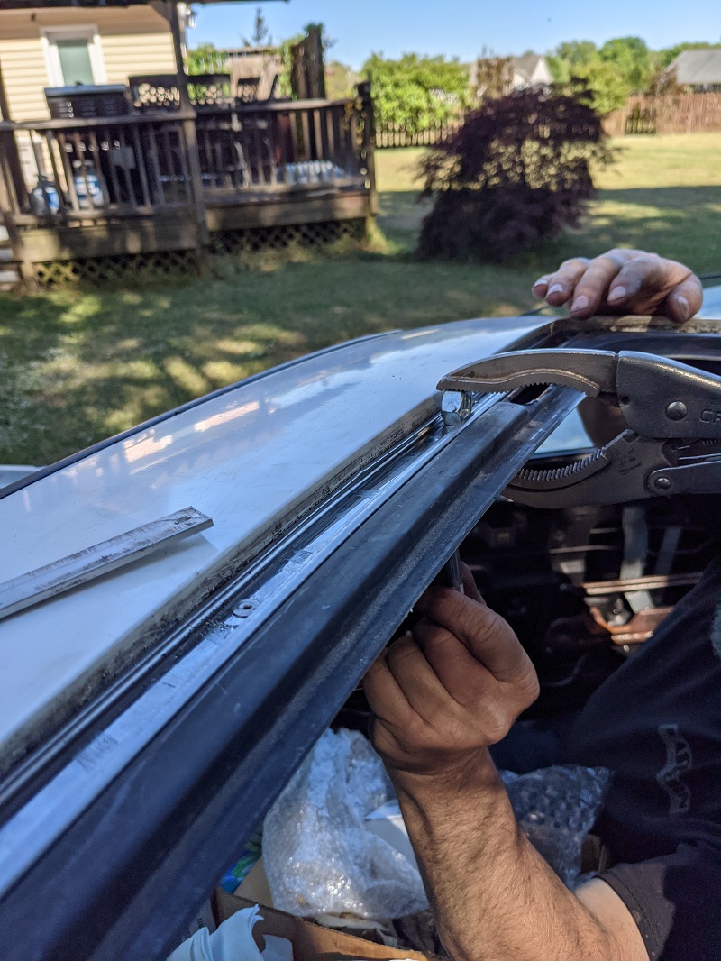 Last was getting the new 'tabs' on the sunroof itself. Unfortunately, the screw started to spin with the fastener after a half turn. Mike worked his magic, using a lot of tape, a blanket, and a grinding disk, to get the head off the old screws.