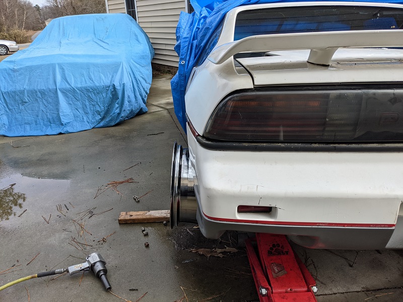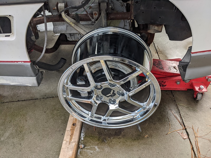 I also brought out one of my Z06 wheels for a test fit and visual check. In theory, we both knew it would fit since the suspension setup with the control arms is mimicing the C5, but it was good to test. With the arms fully dropped, there was still clearance between the upper control arm and the wheel. Same with it raised up to what should be it's maximum height.